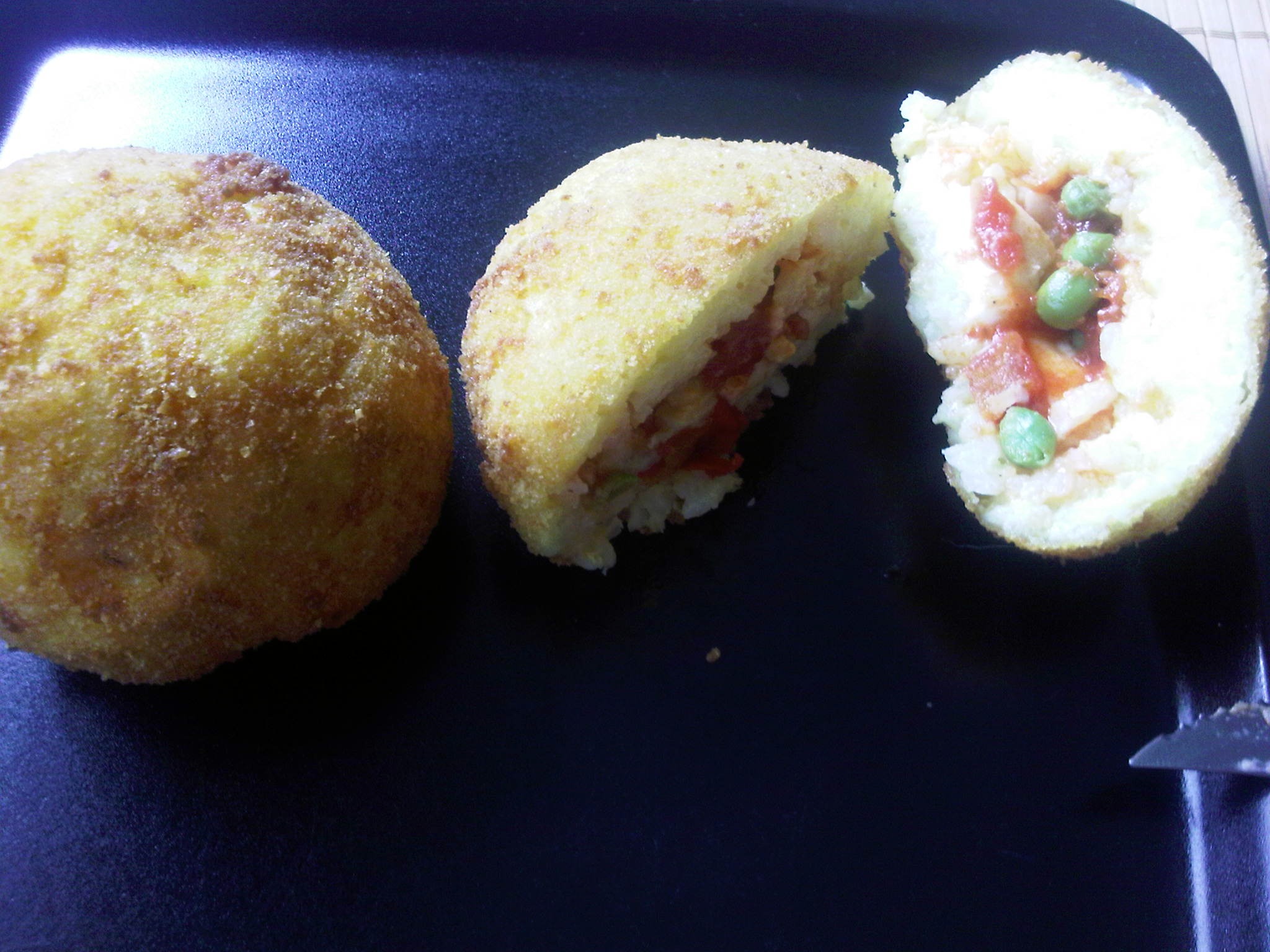 There are a number of local variants and different ways you can fill them. Mine is very simple. I used with tomato sauce, peas and mozzarella. They were hot and fragrant… simply delicious! I ate two of them and I was full but I found out that you can freeze them before frying. I sent the picture of my arancini to a close friend of mine who is from Sicily. She and her mom were very proud of me!