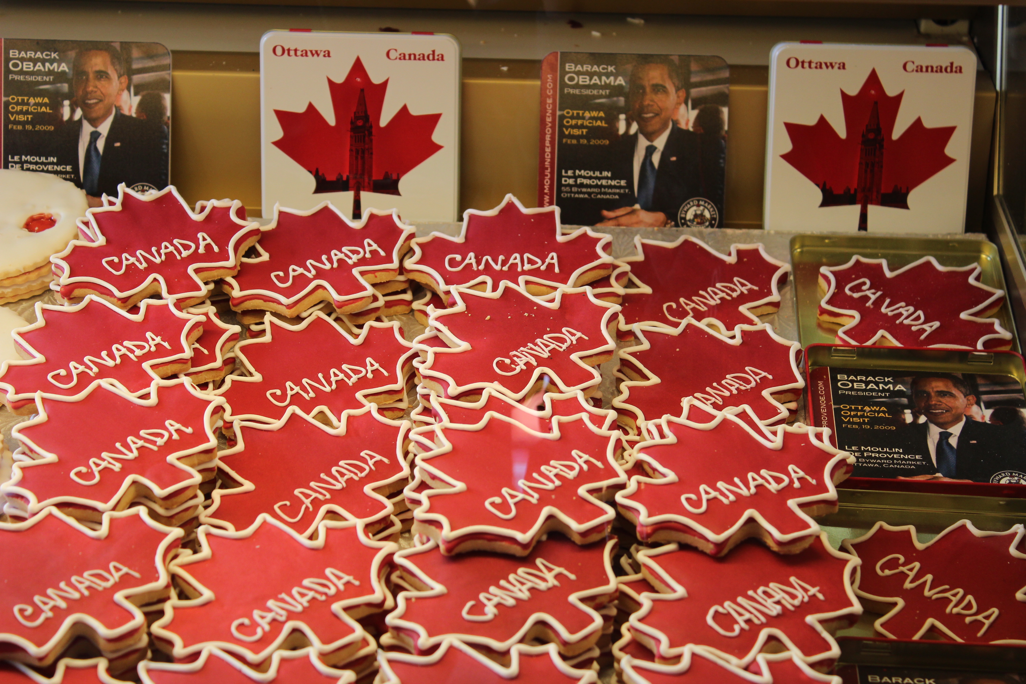 If you go to Ottawa, you have to stop at Moulin de Provence. That’s the name of this fantastic bakery that has become popular in February 2009 when Us president Barack Obama made a quick stop and bought some maple leaf cookies for his wife and daughters. Recently, when I was in Ottawa I went to this bakery that is in the heart of the beautiful Byward market. Let’s say it. Obama made their fortune! He bought three of these cookies and they instantly became best-sellers. In that period the bakery sold more than 2,000 cookies a day, somewhat more than the 200 or 250 cookies they used to sell each week! After Obama’s pit stop they changed their name from “maple leaf cookies” in “Obama cookies” and the bakery became one of the famous attractions of the capital. Their shape is a maple leaf with “Canada” written on them. With the exclamation “I love this Country!”, Obama warmed the hearts of every Canadian on that cold February afternoon. And these cookies definitely warmed mine!