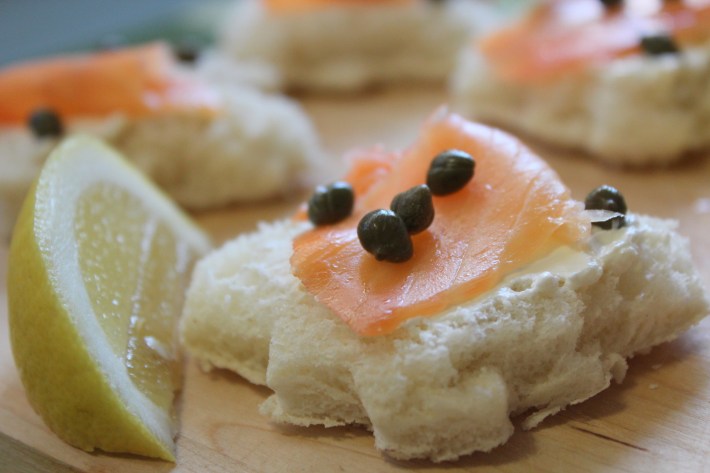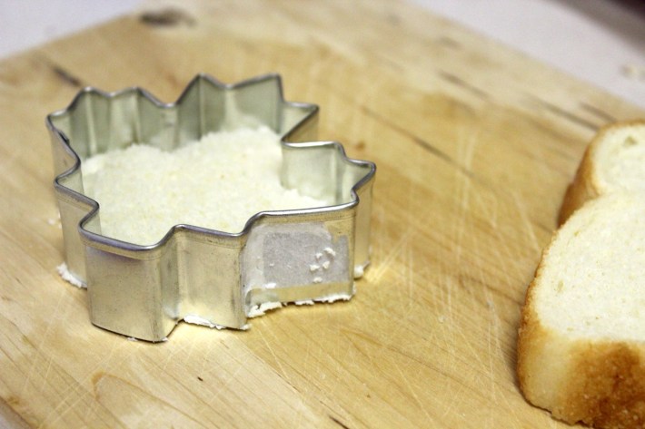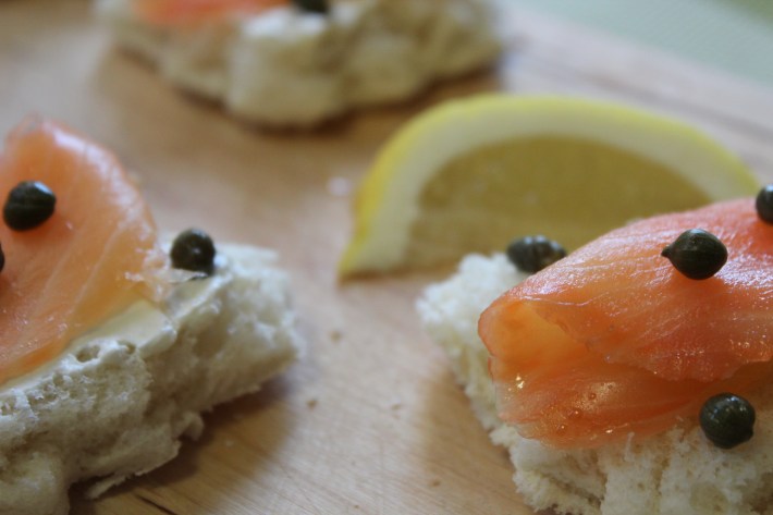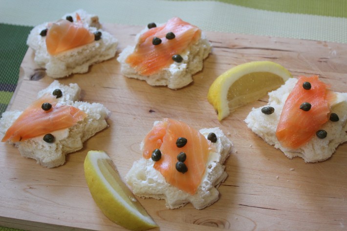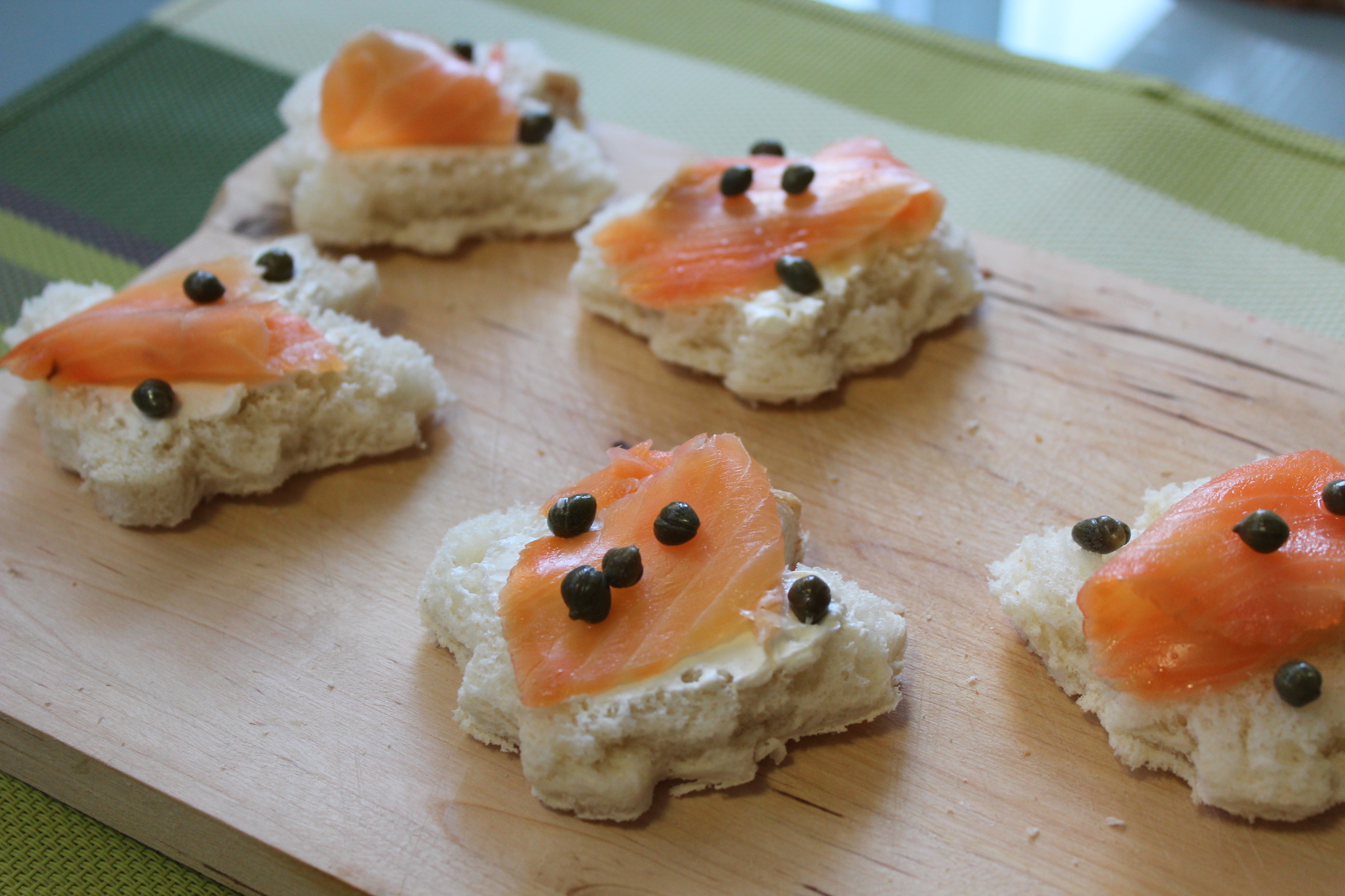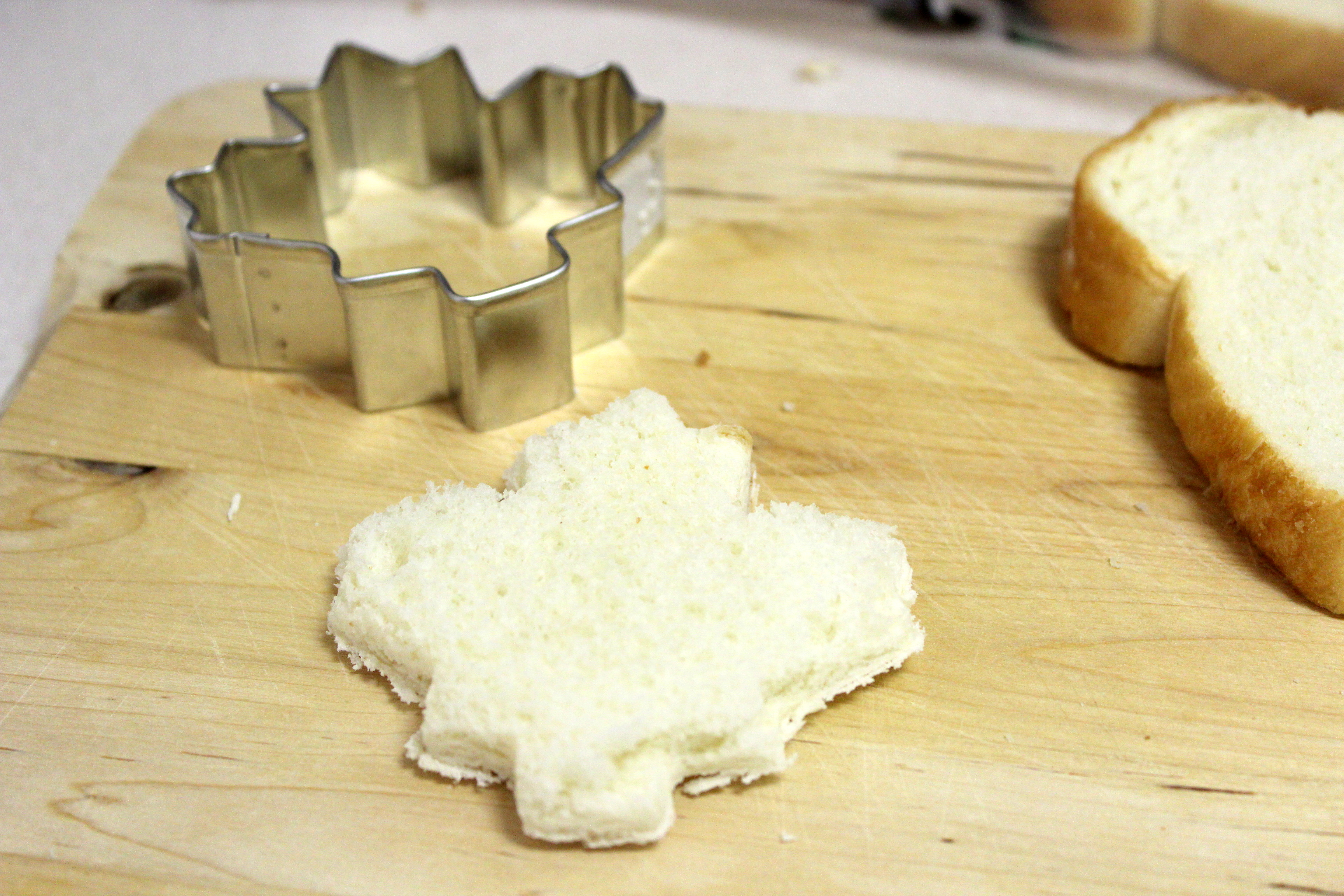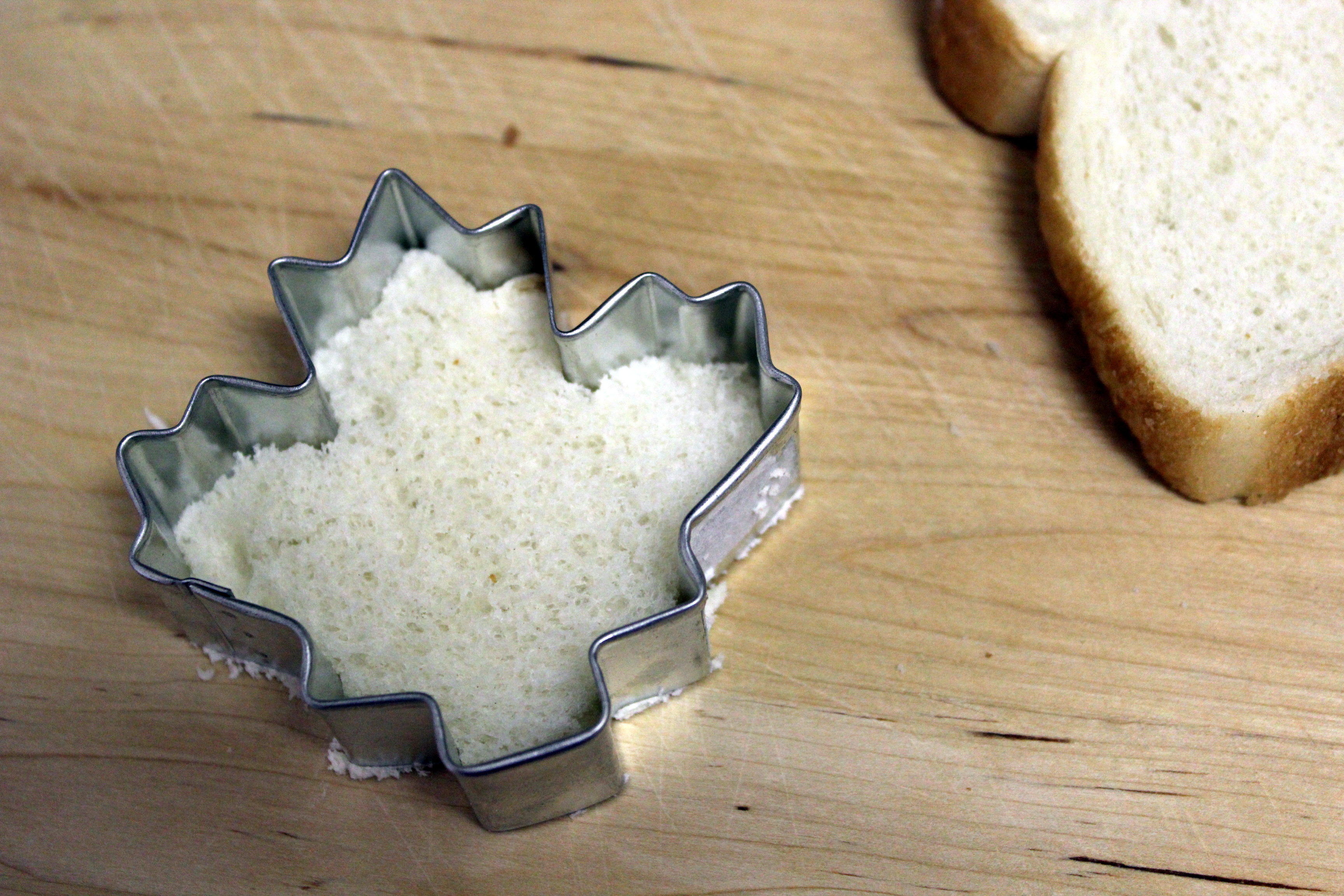 Qualche giorno fa ho avuto questa idea grandiosa e decisamente creativa, lo ammetto… Avevo del salmone che mi si era avanzato dalle mie penne con salmone e vodka e ho deciso di fare delle tartine. In Italia la tartina è un antipasto sfizioso che si prepara tagliando le fette di pancarrè usando gli stampini dei biscotti e mettendo mascarpone, formaggio, crema di burro, salmone, capperi, acciughe e erbe varie. È molto facile e divertente da preparare. Rimuovete la crosta intorno alle fette. Se non avete gli stampini dei biscotti potete tagliare le fette semplicemente a rettangolo o quadrato. Potete spalmare il formaggio che preferite. Qualche idea: caprino, formaggio spalmabile, philadelphia, burro salato. Mettete poi un po’ di salmone e capperi. Io ho usato la formina della foglia d’acero, il simbolo del Canada.