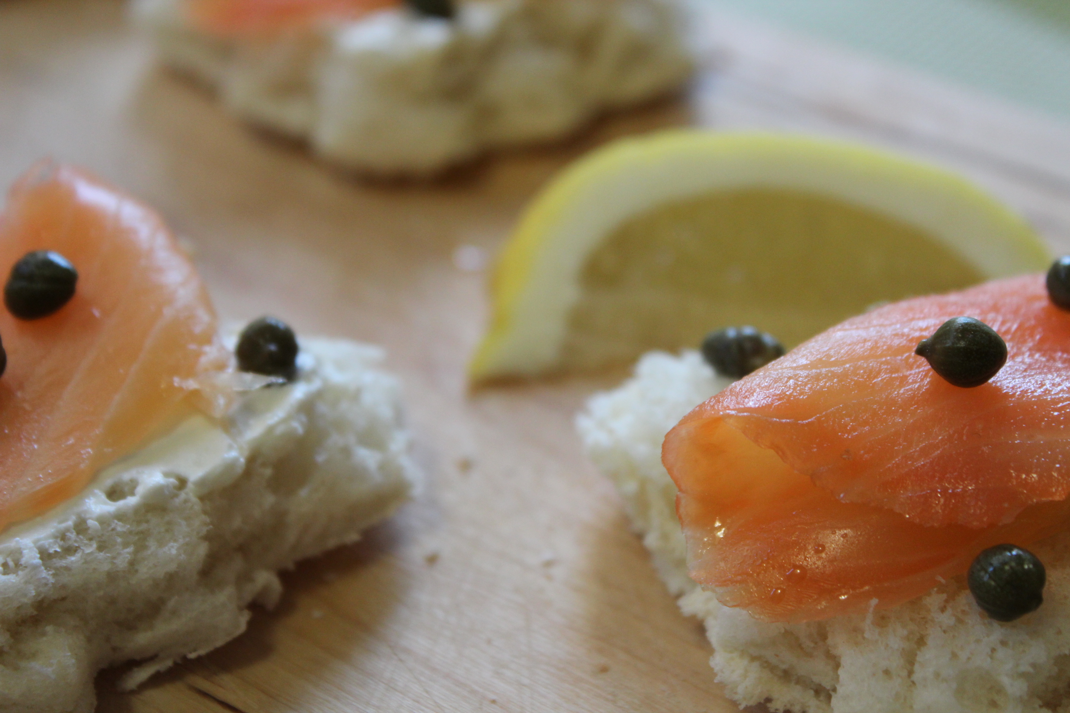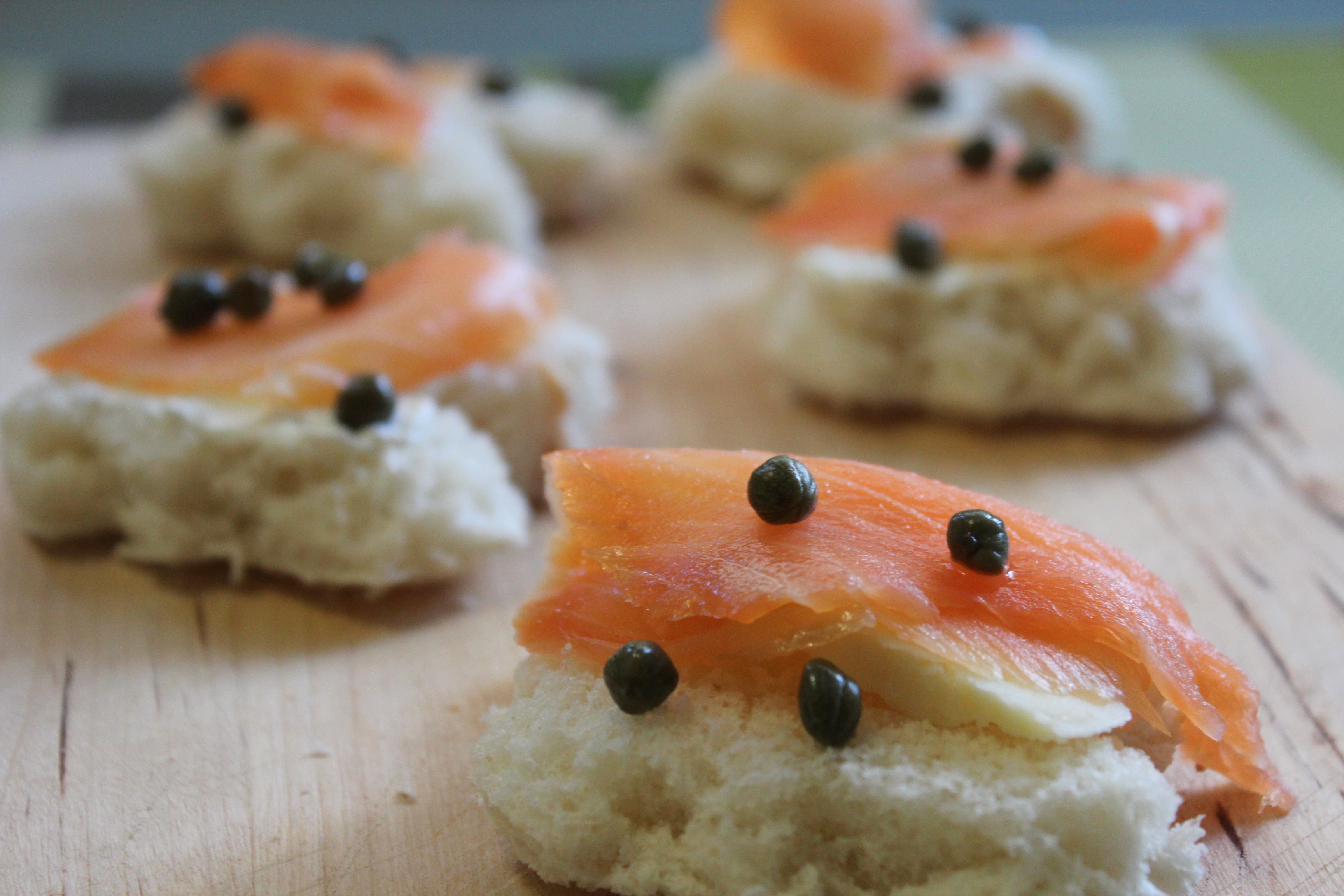 A few days ago I had this great creative idea. I had some salmon left in the fridge that I used for my penne with vodka and I decided to make some “tartine“. In Italy “tartina” (singular; plural: “tartine”) is a yummy appetizer that you can obtain cutting the bread in the shape you prefer using a cookie cutter and putting mascarpone, cheese, butter or butter cream, mayo, salmon, capers, anchovies and herbs on the top. It’s very easy and funny to prepare. You have to remove the bread crust. If you don’t have the cookie cutter you can make some basic shapes – a square or a rectangle. You can spread the kind of cheese you prefer. Some ideas: caprino, cream cheese, philadelphia, salted butter. Then put some salmon and capers. I used the shape of the maple leaf, the symbol of Canada.