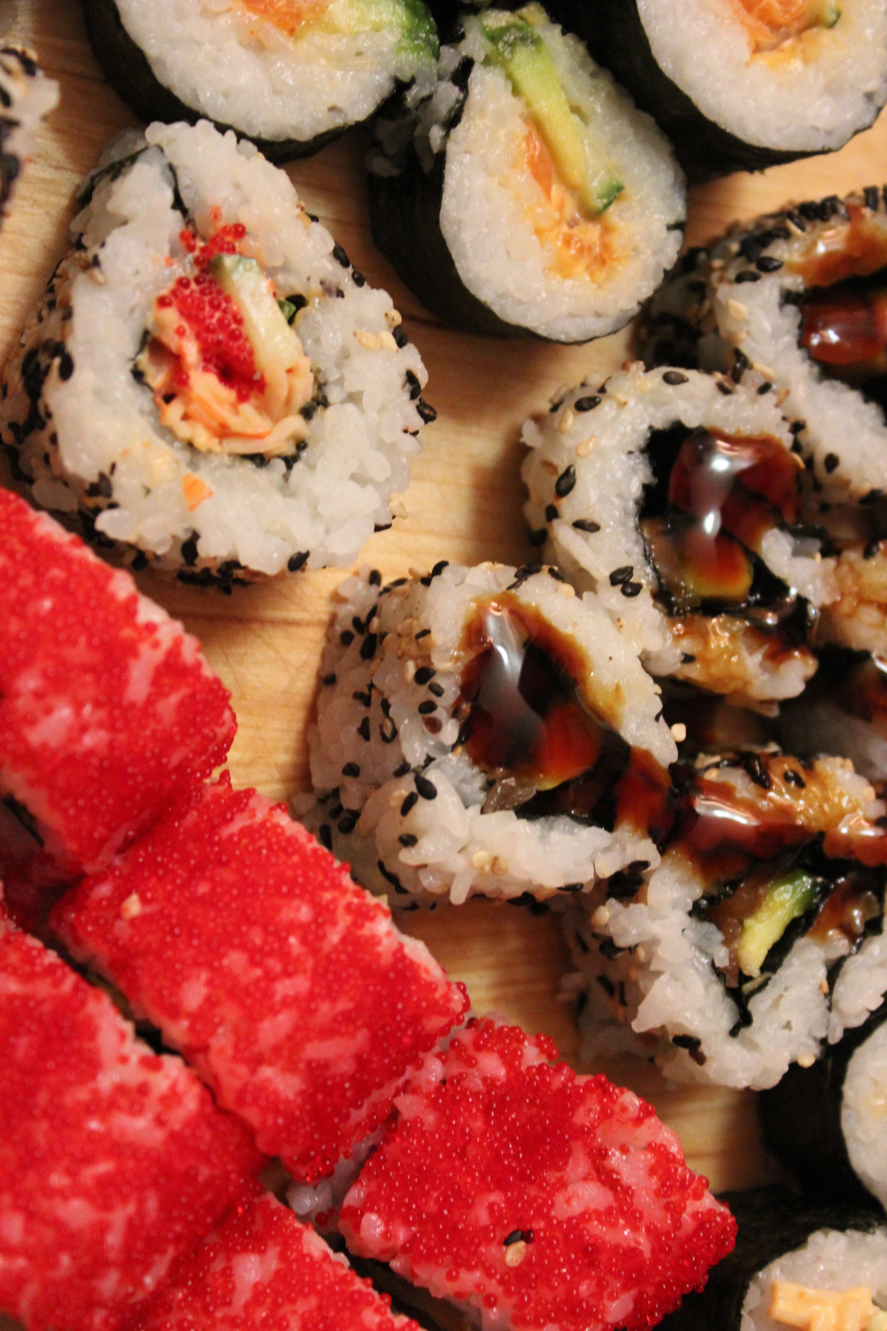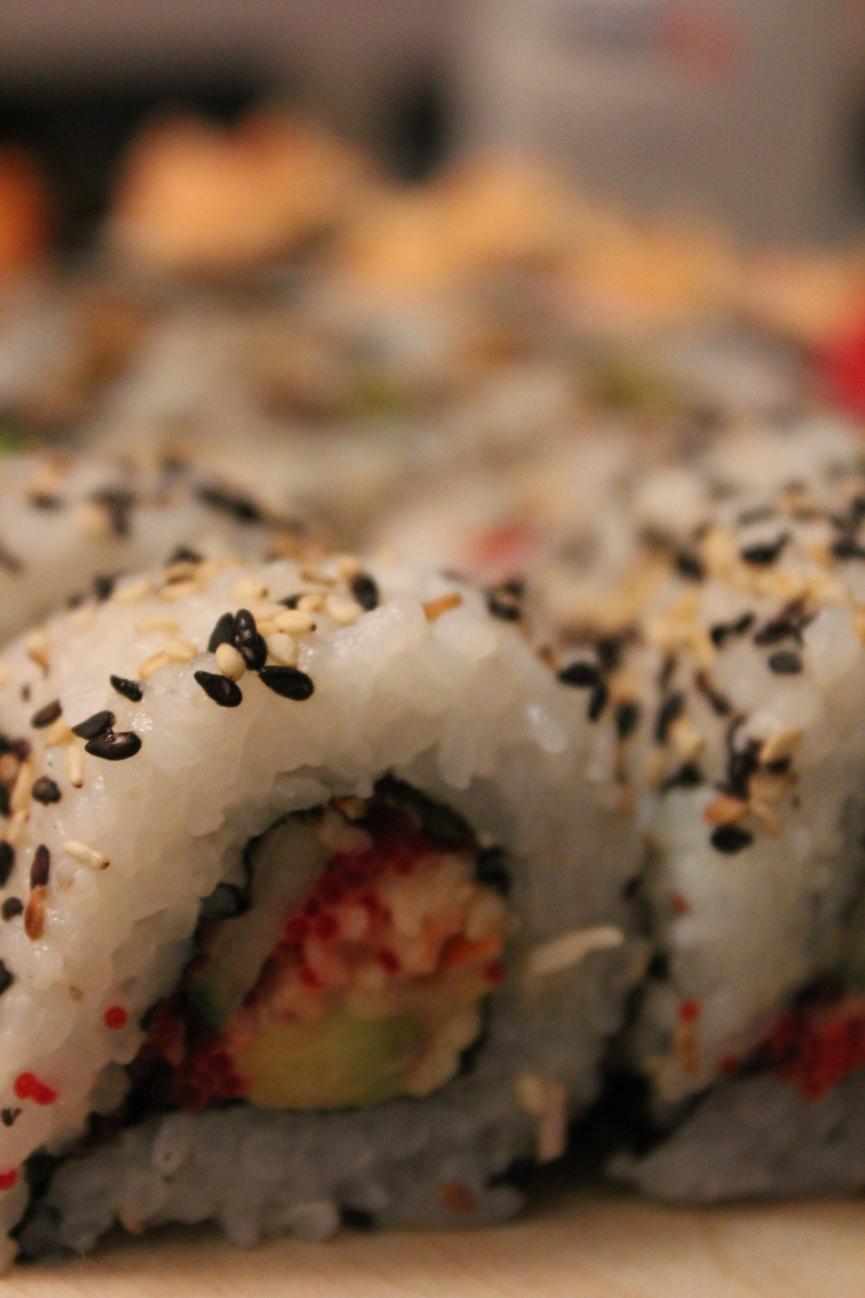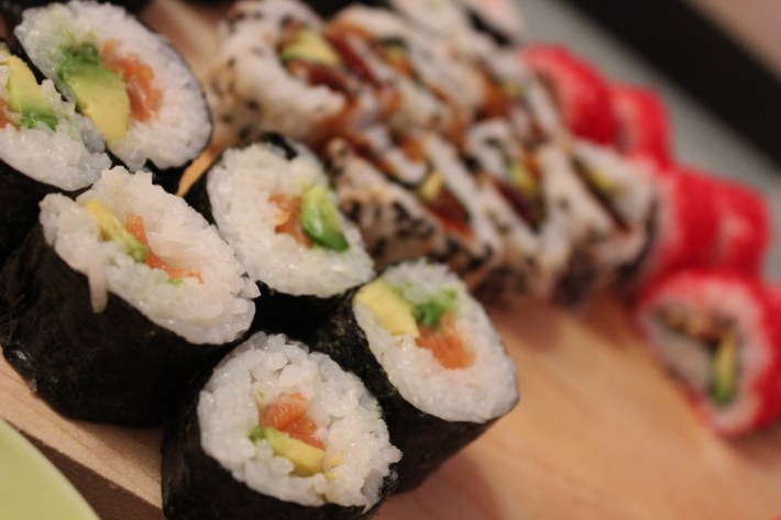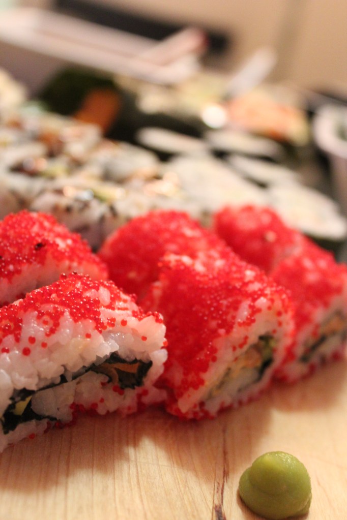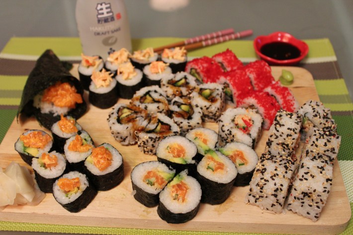 Sapete tutti la mia passione per il sushi. Bene, sono molto orgogliosa di me stessa… posso dire che ora so ufficialmente fare il sushi… quasi come uno chef giappo! Il mio sushi fatto in casa merita due post. In questo vi mostro i risultati. Nell’altro – che penso scriverò tra due mesi visto che sono sempre piuttosto incasinata… sto scherzandooo – vi spiegherò come preparare il riso – che è il vero segreto alla base di un sushi perfetto – e come fare i rolls. Questa era la seconda volta che provavo a farlo e modestamente è venuto molto bene. Ed era buonissimo! In realtà mi ero anche stancata di spendere soldi per andare nel mio sushi bar preferito così ho deciso di imparare a farlo. Anche perché amo le sfide! E quando mi intestardisco io… Avevo provato la prima volta quando era qui il mio ragazzo. Ero super esaltata quando ho finito il mio primo sushi roll. Mi sono sollevata di tre metri da terra dalla felicità. Gli altri poi sono stati un po’ più difficili ma era pur sempre la prima volta e fare il sushi credetemi non è semplice. Per niente. Anzi, purtroppo alcuni rolls non erano venuti bene e li abbiamo dovuti buttare. Non li avevamo chiusi bene. Ci vuole mooolta pazienza. Ho sentito che qui a Toronto si possono seguire delle lezioni con cuochi esperti ma sono anche molto costose. Così mi sono messa a studiare, a guardare video su YouTube e a prendere appunti dai vari siti sull’argomento. Siccome è il long weekend e avevo già preso tutto l’occorrente sabato a St. Lawrence Market, ieri ero così rilassata che ho deciso di riprovarci. Più che mai decisa a farlo come quello che si vede nei ristoranti. Come vedete la testardaggine, se impiegata bene, serve a qualcosa. Ho usato salmone affumicato, granchio e tobiko che sono quelle uova di pesce piccolissime rosse. Verdure: avocado e cetriolo. Ho preparato la salsa piccante facendo un mix con salsa hot chili Sriracha e la maionese. Ho provato a fare subito il temaki o handroll che è quel cono carinissimo che vedete sulla sinistra. I California rolls sono quelli con il riso fuori e l’alga dentro. Poi potete cospargerli di tobiko o semi di sesamo. Quei fogli nero sono il nori, in altre parole alga. La parola maki significa proprio “roll”. Sono quelli che vedete con l’alga fuori e riso dentro, quelli classici insomma. Ho messo sopra un po’ di salmone tritato con spicy sauce. Si chiamano “Dynamite Rolls”. Se decidete di fare il sushi in casa può essere un po’ costoso ma solo la prima volta. Perché se avete aceto di riso, il sake per cucinare, il nori, il riso, gli ingredienti per la salsa piccante, i semi di sesamo, la soya (io uso quella con poco sodio) e il tappetino per arrotolarli, poi dovrete solo comprare la volta successiva il pesce fresco e le verdure.