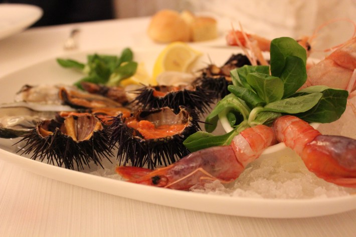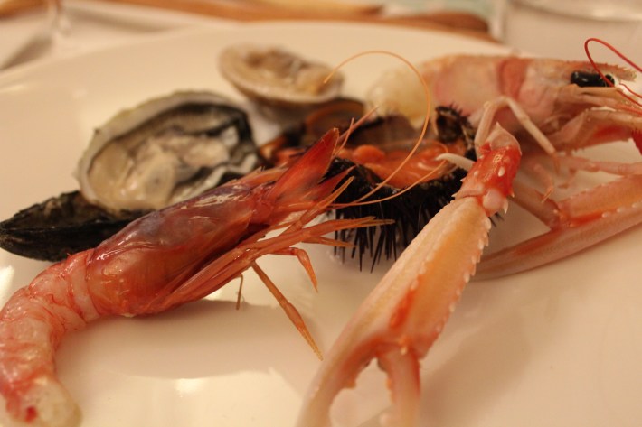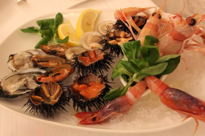 Raw fish: urchin (you can eat it with bread), shrimps, clams, mussels, oysters and “scampi” (a kind of small lobster) / Pesce crudo: ricci (che si possono mangiare con il pane), gamberi, vongole, cozze, ostriche e scampi