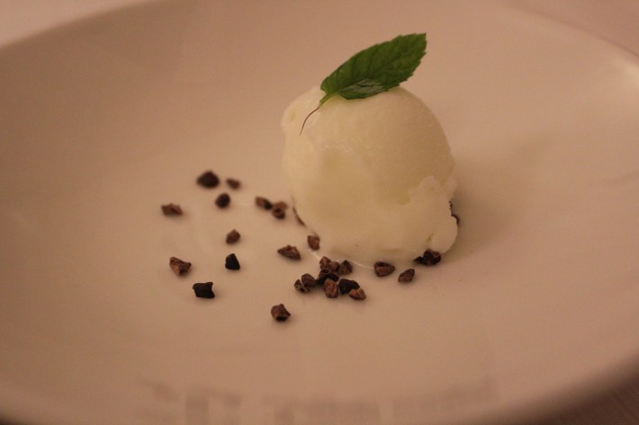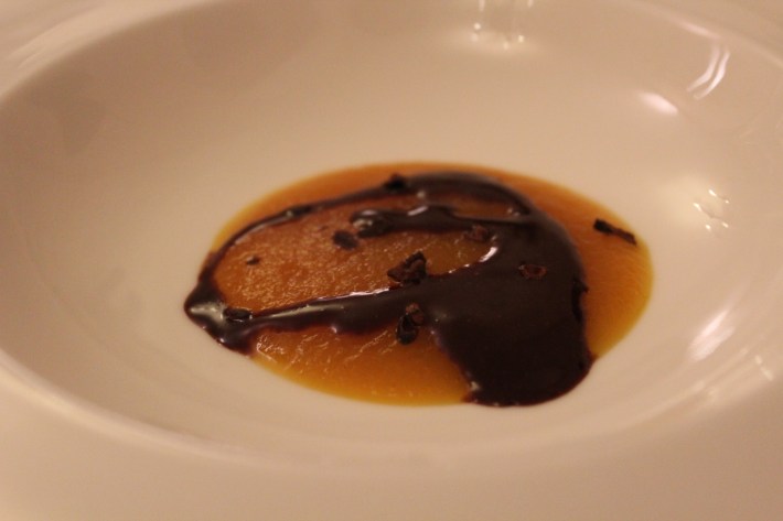 Pre-dessert: Cream of pumpkin with dark chocolate and chocolate chip / Pre-dessert: Vellutata di zucca con cioccolato fondente e scaglie di cioccolato