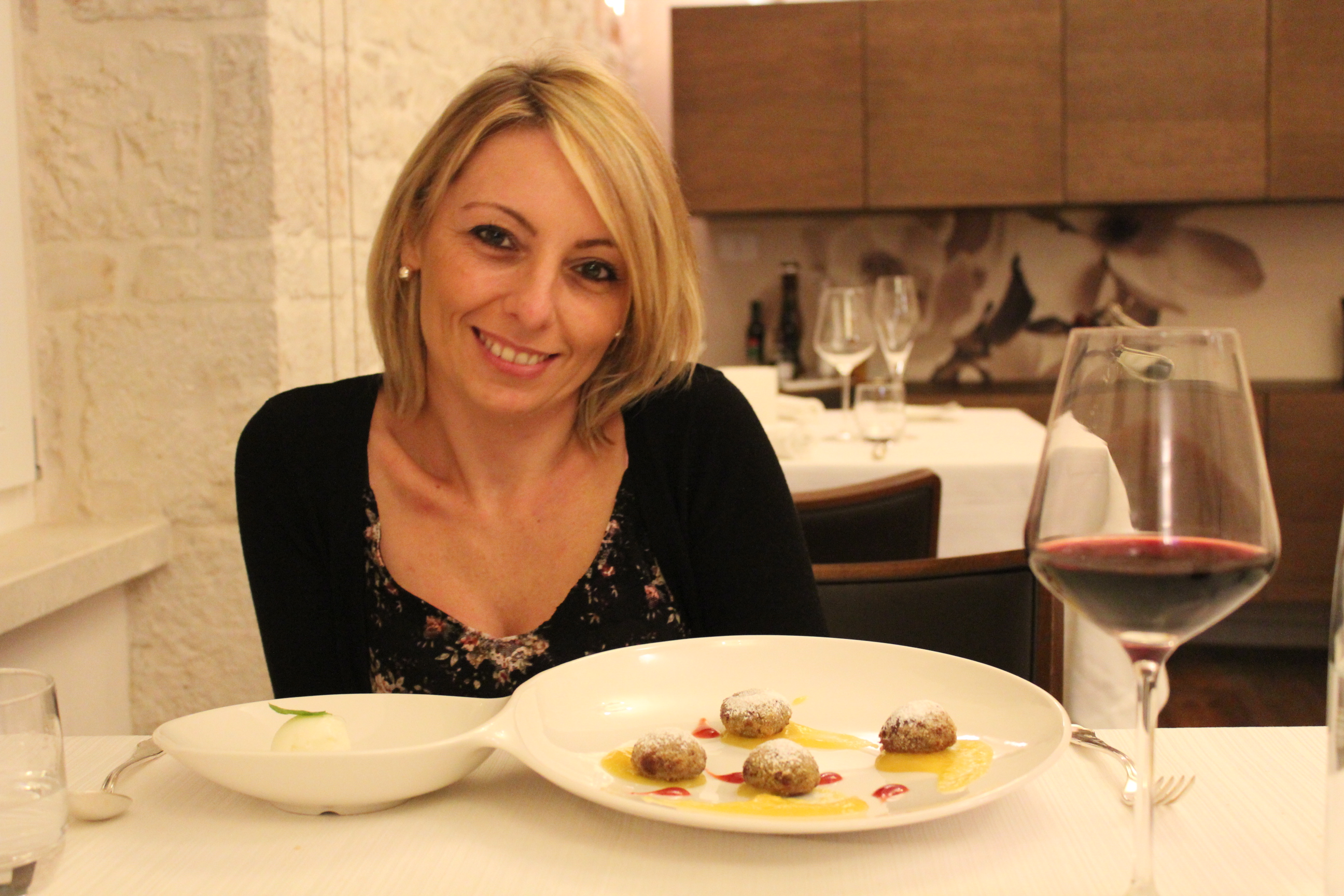 Sono tornataaa! Ho lasciato il Canada tre settimane fa e ora sono in Italia. Ogni giorno che passa mi sto rendendo conto che questa è stata davvero la decisione migliore! Ma non avevo dubbit. Vorrei dirvi una marea di cose e farvi vedere le migliaia di foto che ho già scattato in queste settimane. Ho visitato dei posti meravigliosi e provato nuovi piatti pugliesi. Quindi rimanete sintonizzati! In più mi sono inamorata della focaccia barese ma questo merita un post a parte. Il mio primo post italiano contiene una combinazione di ingredienti invidiabile: love e food! In altre parole: il mio primo piatto di pesce crudo della mia vita e… Gianvito! Ho festeggiato con lui il mio compleanno lo scorso 8 novembre e siamo andati a cena in un posto molto speciale: il “Menelao a Santa Chiara” a Turi, a pochi chilometri da Bari. Si trova davanti alla chiesa di Santa Chiara, tra le mura dell’incantevole centro storico! La serata è stata un vero e proprio viaggio di sapori e dei sensi: ambiente elegantissimo, cibo di ottima qualità e lista di vini raffinati. Spero che le foto vi piacciano!