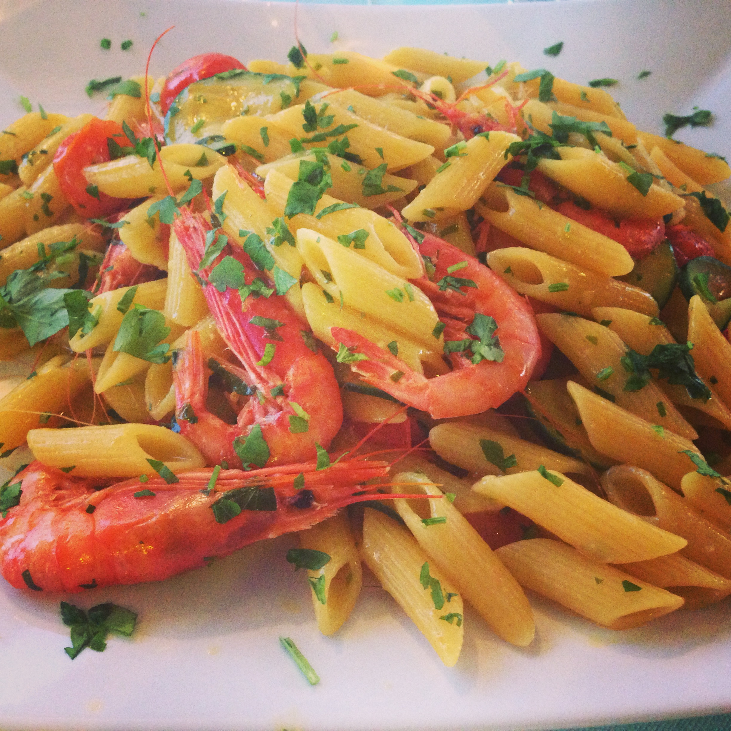 Mezze penne ai gamberi e zucchine (Ristorante “Osteria”)
