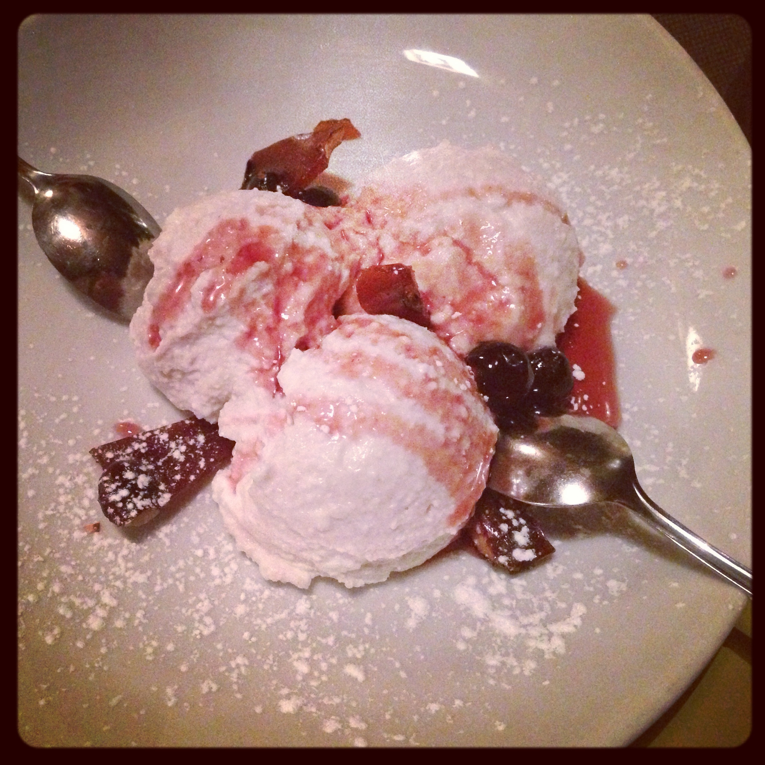 Sembra gelato… invece è ricotta con sciroppo di amarene e croccante di mandorle (al ristorante “L’Osteria” di Porto Rotondo) / It looks like icecram but it’s ricotta cheese with cherry syrup and crunchy almonds