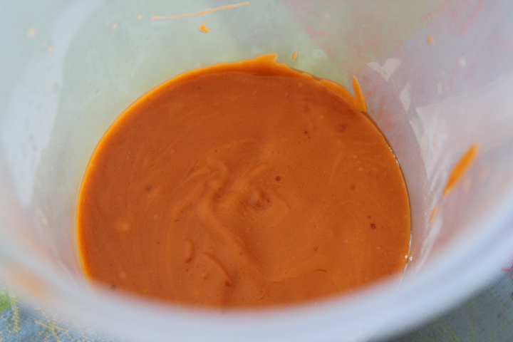 Mettete la marinatura in un recipiente cilindrico alto e passatela al minipimer. Questa operazione serve ad emulsionare la marinatura e renderla cremosa e omogenea.