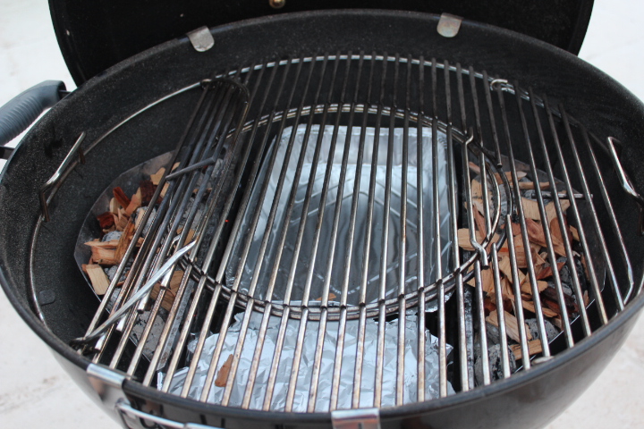 Preparate gli hickory chunks o chips (legnetti di melo o noce americano) per l’affumicatura e sistemate il bbq per la cottura indiretta. Stabilizzate a circa 170°C.