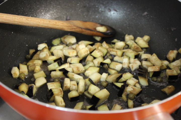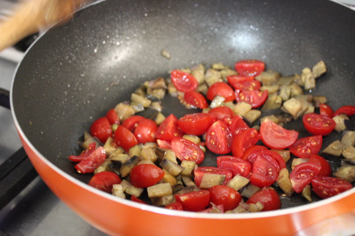 Fate riscaldare l’olio e soffriggete la cipolla. Aggiungete la melanzana tagliata a tocchetti e un pizzico di pepe. Lasciate cuocere per 10 minuti aggiungendo di tanto in tanto dell’acqua (la melanzana tende ad assorbirne molta). Aggiungete i pomodorini tagliati a metà o in 4 parti, salate e lasciate cuocere per altri 4-5 minuti.