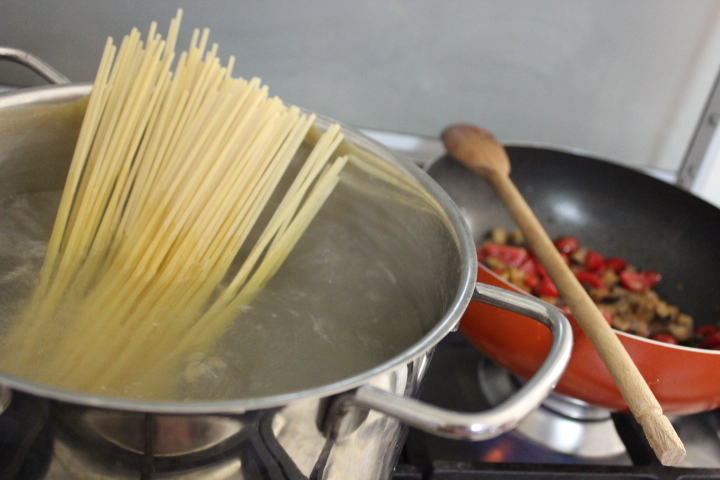 In the meantime, bring the water to a boil, add salt and the pasta, and cook al dente!