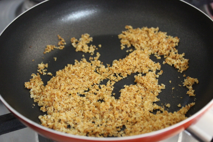 During the last few minutes put two tablespoons of extra virgin olive oil in another pan and fry the breadcrumbs. Drain the pasta and add it to the pan with the sauce. Sauté for 30 secondos and finally add the breadcrumbs. Serve with crumbled peperoni cruschi, basil leaves and pecorino cheese (I used the Sardinian one). Add a drizzle of olive oil. Enjoy!