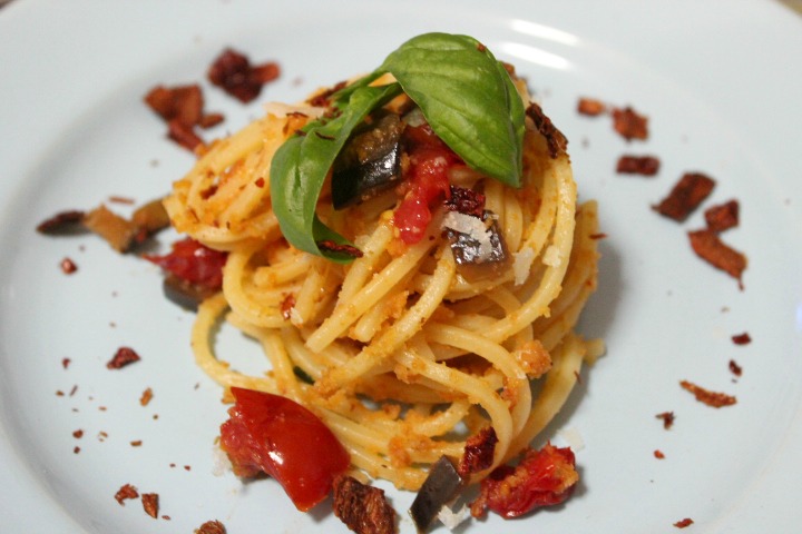 Spaghetti with eggplant, cherry tomatoes and peperoni cruschi