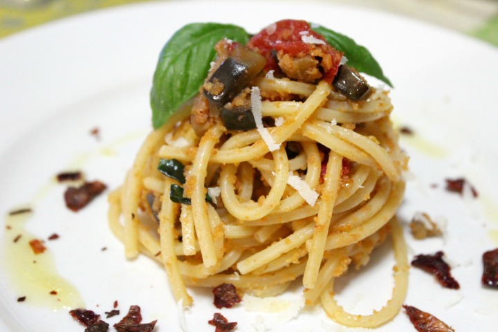 Spaghetti con melanzana, pomodorini e peperoni cruschi / Spaghetti with eggplant, cherry tomatoes and peperoni cruschi