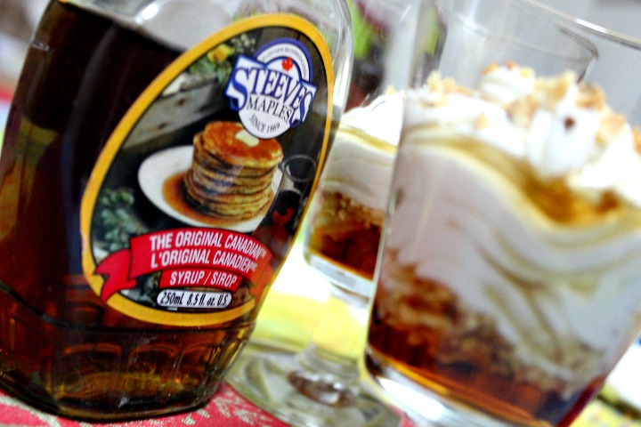 Mescolate lo yogurt con lo sciroppo d’acero. Mettere sul fondo del bicchiere lo sciroppo e un po’ di granella. Aiutandovi con una sac-à-poche versate lo yogurt nel bicchiere formando una sorta di spirale. Irrorate con lo sciroppo d’acero e aggiungete ancora un po’ di granella. Fatto!
