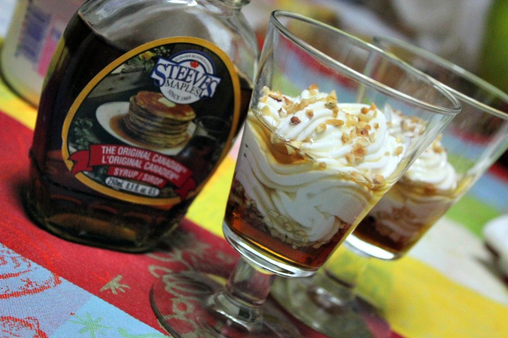 here is the recipe for a delicious dessert that I have seen in a TV program: greek yogurt with maple syrup. I used light greek yogurt minced hazelnuts instead of dried fruit. The preparation is very easy and it requires no more than 5 minutes. As you can see in the photos, the result is elegant and your friends will notice it, that’s for sure. You will make a great impression with your guests. I love maple syrup. The sweet flavor of the maple syrup reminds me of my six years spent in Canada. Do I miss it? I’ll answer next time… Meanwhile, try this recipe! 😉