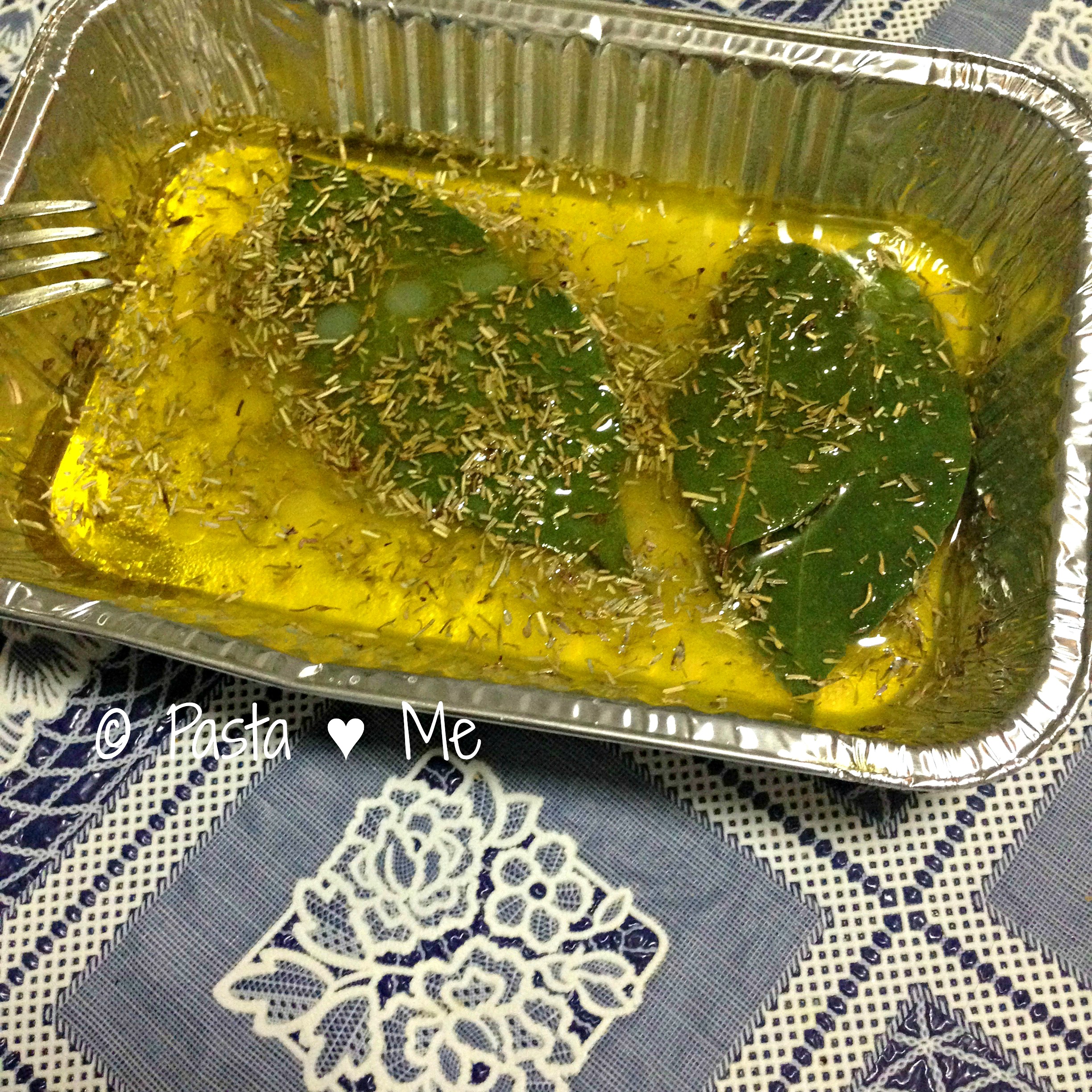 Begin to prepare the marinade. In an oven pan dish or an aluminum container put the olive oil, then squeeze out the juice of a lemon. Mix the ingredients with a fork. Then add the herbs: rosemary, thyme and bay leaf. Pour the balsamic vinegar.