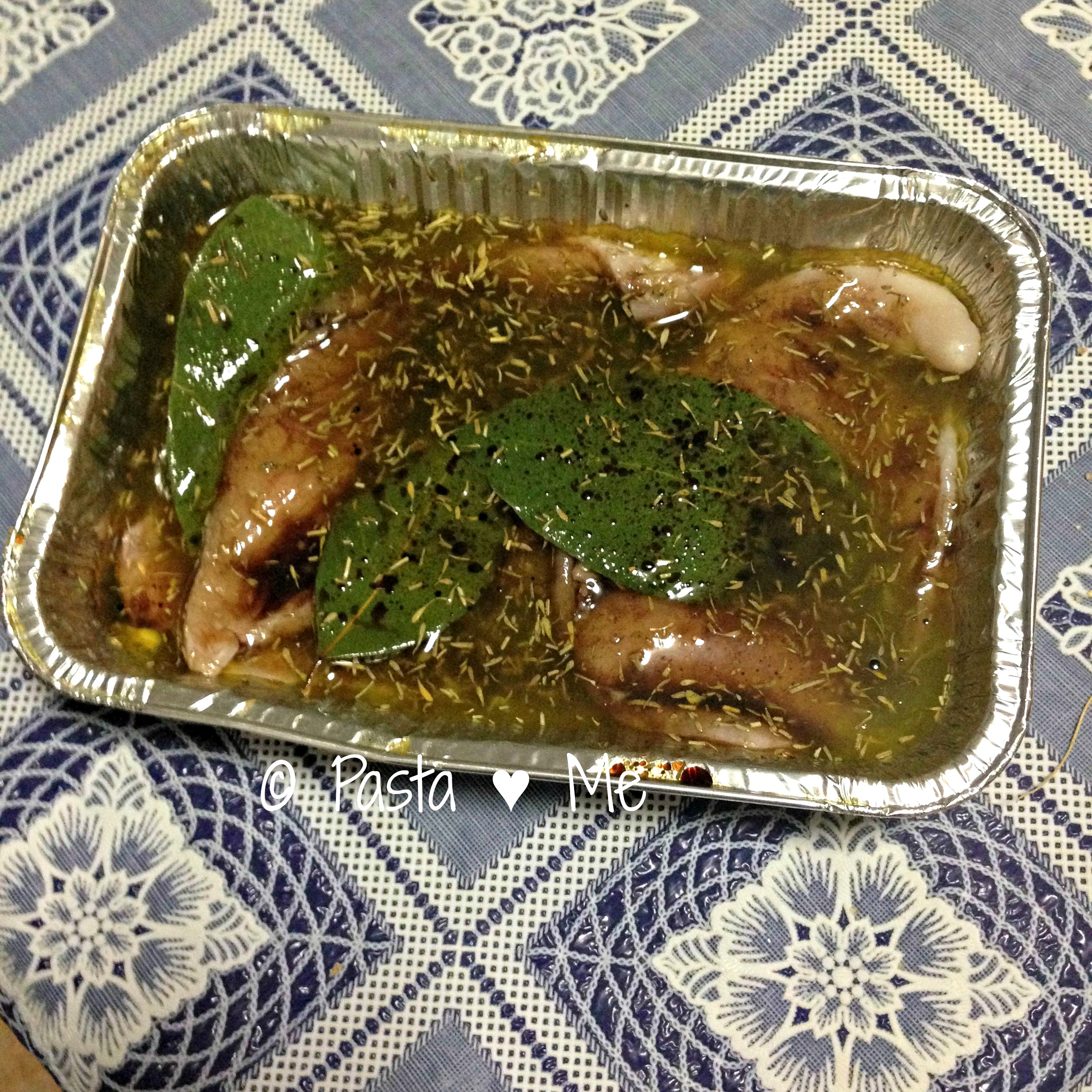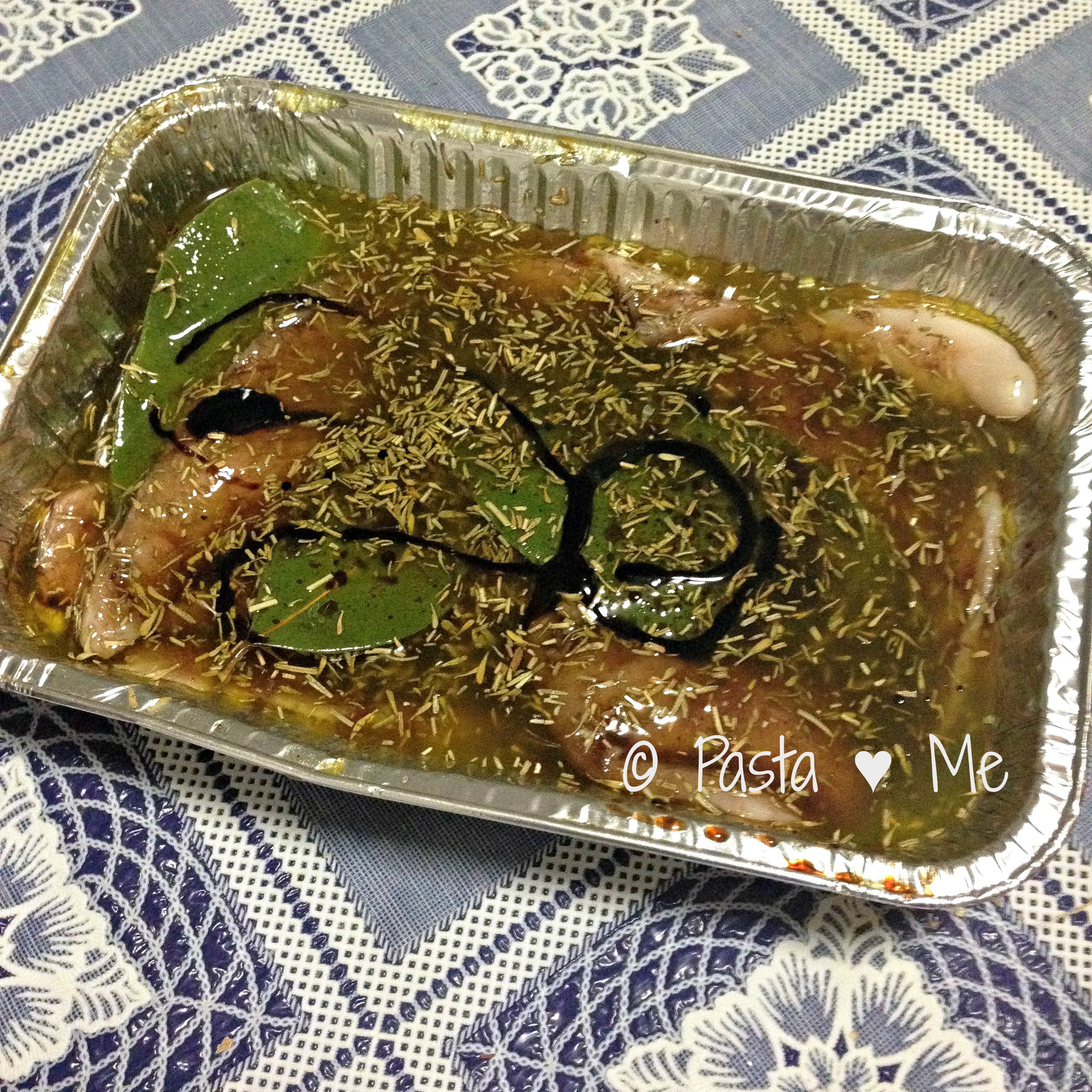Iniziate a preparare la marinatura. In una pirofila o un contenitore di alluminio mettete prima di tutto l’olio d’oliva, poi spremete il succo del limone attraverso un colino. Emulsionanate gli ingredienti con una forchetta. Aggiungete quindi le erbe: rosmarino, timo e alloro. Versate quindi l’aceto balsamico.