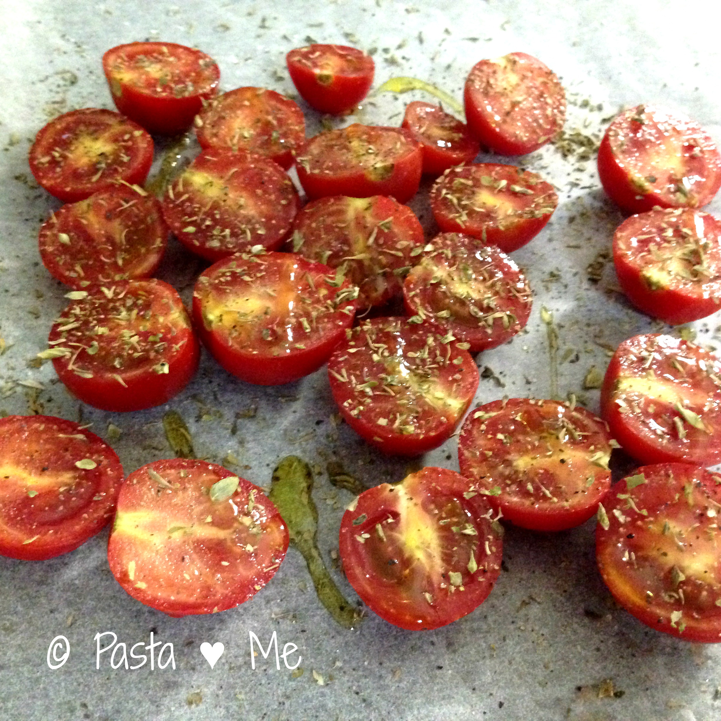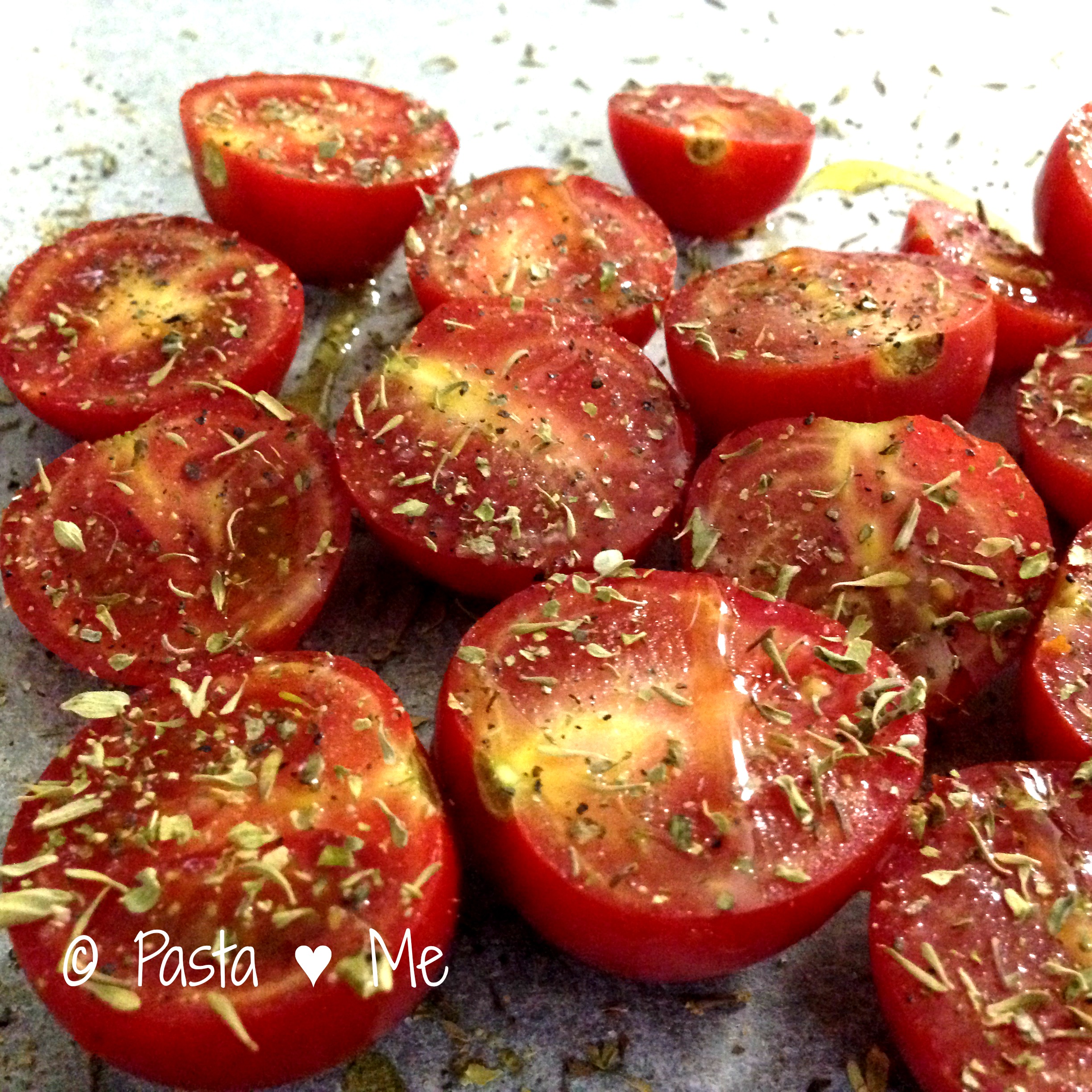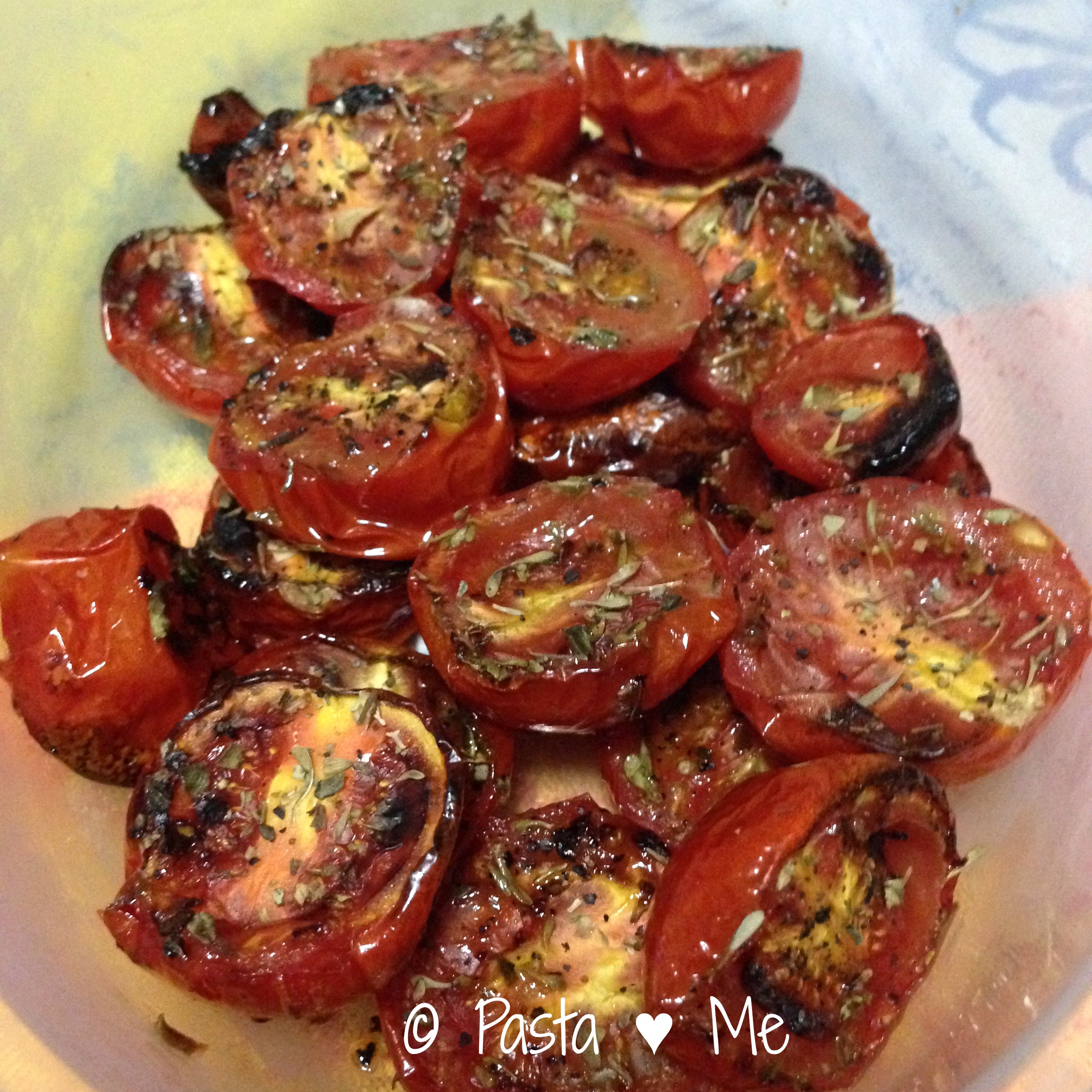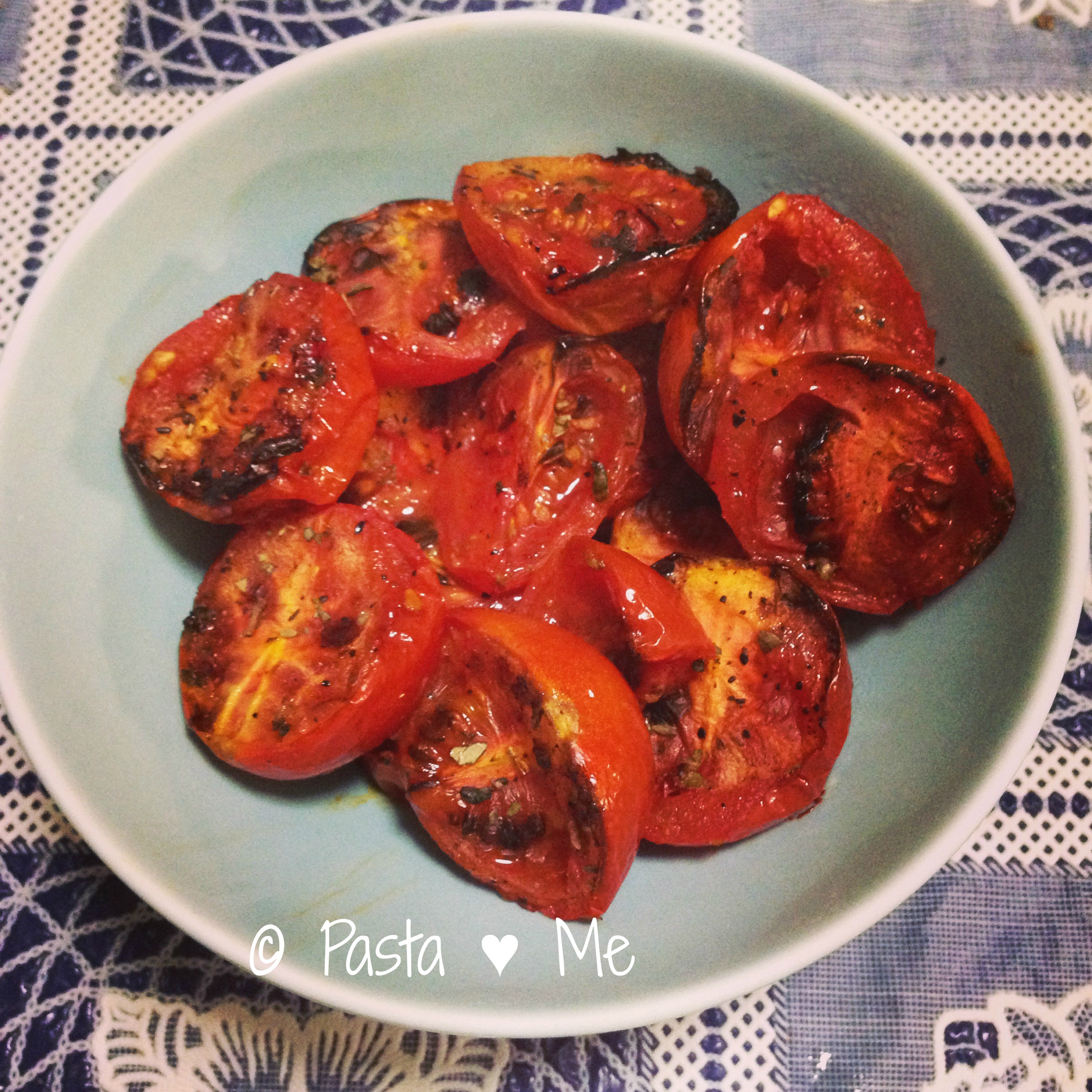 Disponeteli su una teglia ricoperta da carta da forno e con la parte del taglio rivolta verso l’alto. Aggiungete uno spicchio d’aglio sbucciato. Salate e pepate. Aggiungete quindi il timo e l’origano, un filo d’olio e lo zucchero. infornate a 200 per mezz’ora. Spegnete il forno e accendete il grill e proseguite la cottura fino a quando i vostri pomodorini saranno belli abbrustoliti.