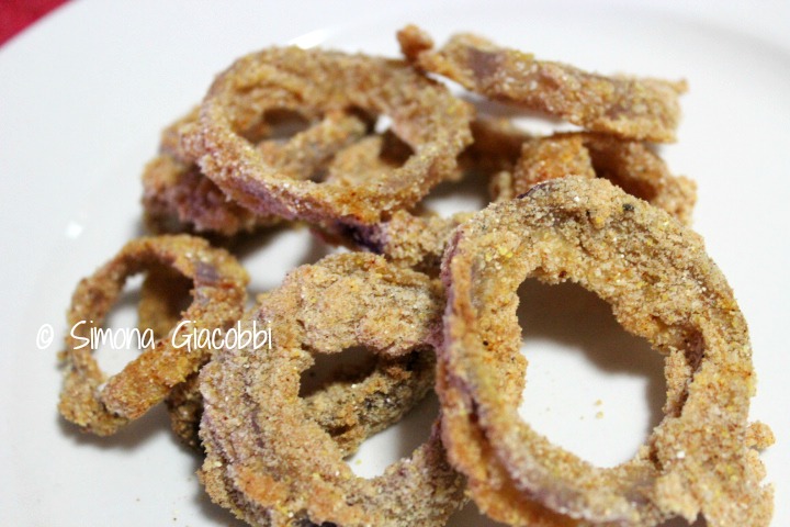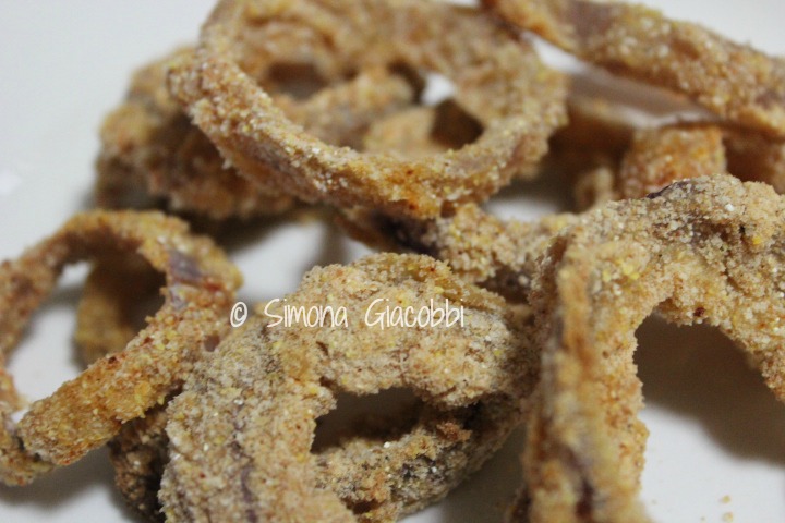 In un piatto mescolate la farina di mais, il pangrattato, il sale, il pepe e la paprika dolce. Immergete gli anelli di cipolla nella pastella e passateli nell’impanatura. Disponeteli in una teglia con carta forno (io ho usato una vaschetta di alluminio). Aggiungete un filo d’olio extravergine d’oliva e infornate a 200°C per 20 minuti.