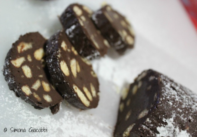 Ora dovrete solo aspettare che si solidifichi. Una volta indurito rimuovete la carta da forno (si staccherà facilmente… non spaventatevi se il salame non è perfettissimo perché lo zucchero a velo andrà a coprire le eventuali imperfezioni), mettetelo su un tagliere di legno o plastica e spolverate con zucchero a velo. A questo punto tagliate le fettine con un coltello proprio come si fa con un salame normale. Buonissimo!!!