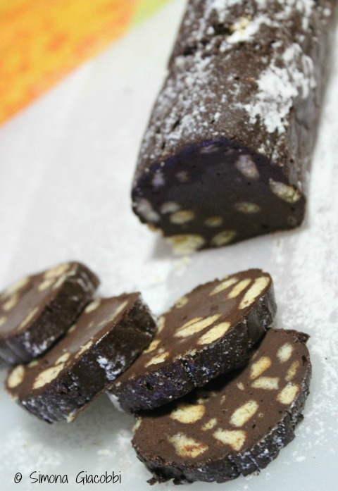 Ho preparato questa delizia due giorni fa. Non resisto e devo assolutamente rendervi partecipi del risultato sfiziosissimo! È un dolce d’effetto e decisamente goloso. Esistono diverse versioni più “corpose” perché tradizionalmente il salame di cioccolato si prepara con burro, uova e panna e cioccolato. Ma io non ho usato nessuno di questi ingredienti. Sì sì avete letto bene. Ho trovato una ricetta sul web e l’ho riadattata un po’ a modo mio. È un dolce versatile quindi potete sbizzarrirvi. Per esempio, al posto del brandy potete aggiungere un po’ di caffè oppure non mettere nessuno dei due per rendere il vostro salame ancora più leggero… se di “leggerezza” si può parlare… 😉 O aggiungere un po’ di nocciole tritate all’impasto. In ogni caso, se seguite alla lettera le istruzioni di questa ricetta che è facilissima e velocissima, il successo è garantito!!