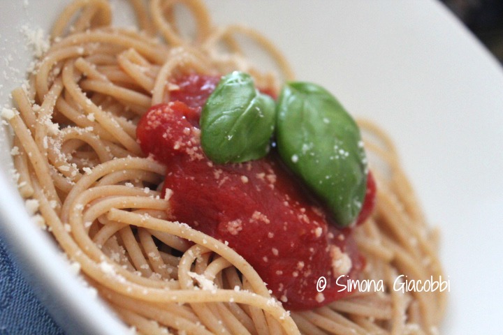 Nella foto: spaghetti integrali con sugo al pomodoro e spolverata di grana padano.