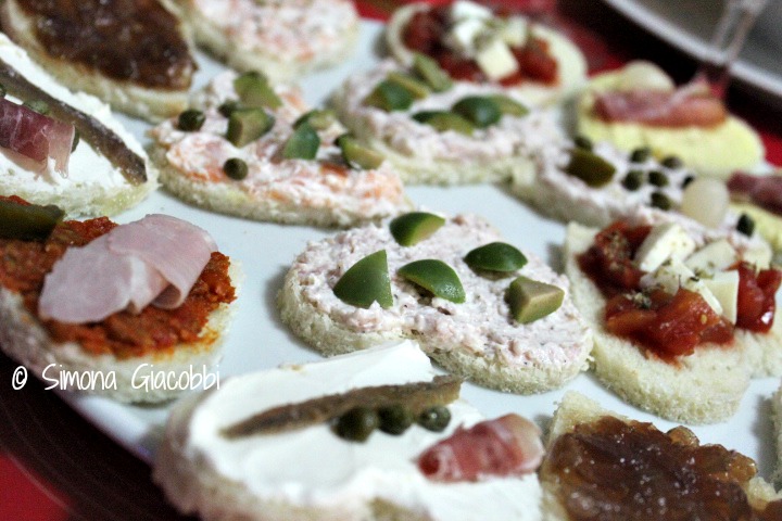 Tartine con varie mousse al salmone e al prosciutto cotto, mostarda di cipolle in agrodolce che adoro, salsa piccante, speck, olive Sant’Agostino, acciughe, capperi… e chi più ne ha…
