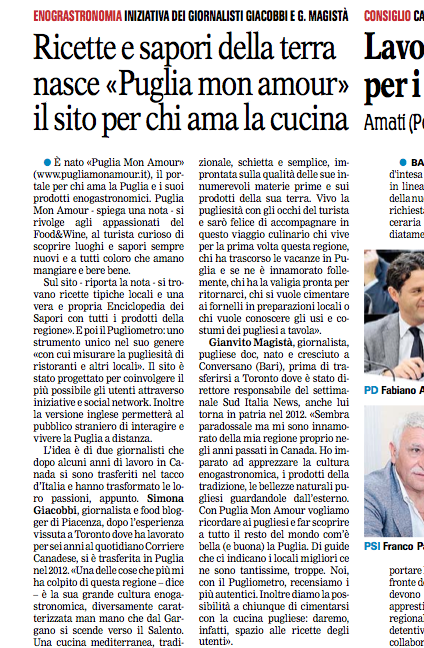 Gianvito Magistà, giornalista, pugliese doc, nato e cresciuto a Conversano (Bari), prima di trasferirsi a Toronto dove è stato direttore responsabile del settimanale Sud Italia News, anche lui torna in patria nel 2012. “Sembra paradossale ma mi sono innamorato della mia regione proprio negli anni passati in Canada. Ho imparato ad apprezzare la cultura enogastronomica, i prodotti della tradizione, le bellezze naturali pugliesi guardandole dall’esterno. Evidentemente prima le davo per scontate. Con Puglia Mon Amour vogliamo ricordare ai pugliesi e far scoprire a tutto il resto del mondo com’è bella (e buona) la Puglia. Far vivere a tutti l’esperienza Puglia nella sua autenticità. Di guide che ci indicano i locali migliori ce ne sono tantissime, troppe. Noi, con il Pugliometro, recensiamo i più autentici. Inoltre diamo la possibilità a chiunque di cimentarsi con la cucina pugliese: daremo, infatti, spazio alle ricette degli utenti”.