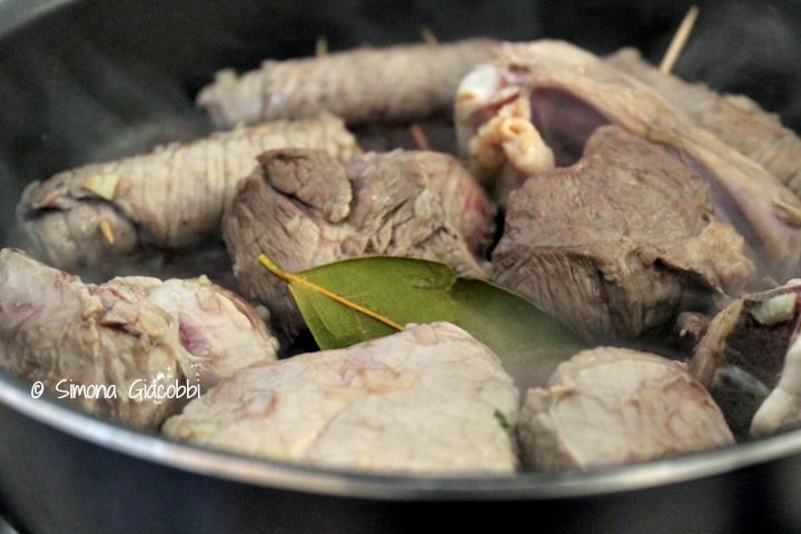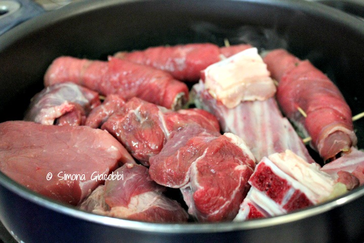 Preparate l’olio, la cipolla tritata, le brasciole, i pezzi di maiale, manzo e agnello. Fate rosolare a fuoco vivo a lungo girando la carne di tanto in tanto finché sarà ben colorita.