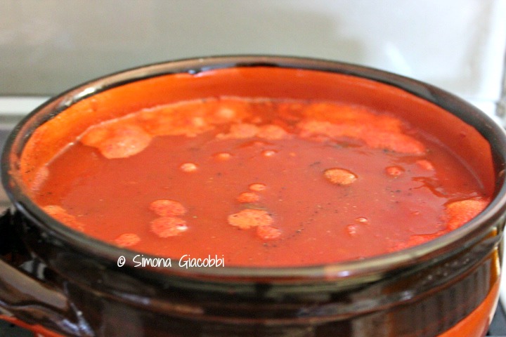 Then add the peeled tomatoes, the tomato sauce, a glass of water, basil, salt and pepper and let simmer for 5 hours stirring occasionally and patiently with a wooden spoon so that the ragu does not stick to the pan. It will come out thick and gravy and the oil will come to the surface.