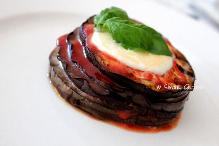 Adoro questo piatto. È facile, veloce da preparare, gustoso e light. Ed è l’ideale se vi si è avanzata una mozzarella dalla pizza fatta in casa nel weekend 😉 Dovrete accendere il forno per 15-20 minuti quindi non ve lo consiglio in estate, quando fuori ci sono 40 gradi all’ombra, a meno che non abbiate un ventilatore o aria condizionata sparata a manetta in cucina. Può essere servito come antipasto e, perché no, come piatto unico se siete a dieta. Una mozzarellina è concessa anche dai dietologi talebani. Io l’ho preparato per pranzo oggi ed era delizioso! Volendo potete aggiungere una grattugiata di pecorino tra una fetta e l’altra (anche se secondo me non è necessario visto la presenza della mozzarella) oppure erbette o spezie a vostro piacimento. Io l’ho fatta così, semplice e gustosa. Inoltre è anche bella da vedere, non trovate?