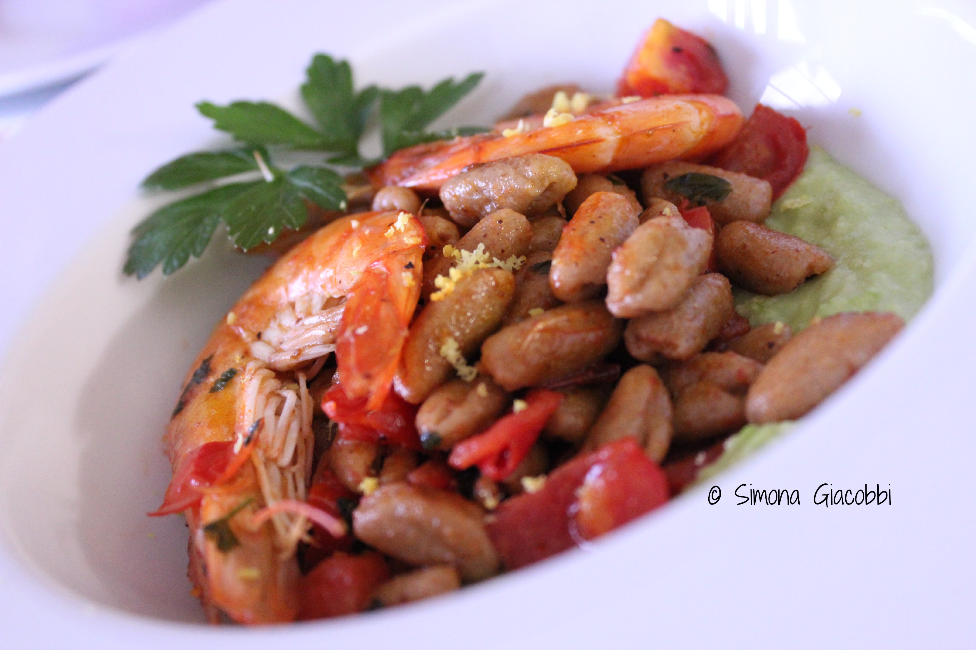 Whole wheat cavatelli with prawns, cherry tomatoes, lemon zest and fava beans cream (ENGLISH VERSION)