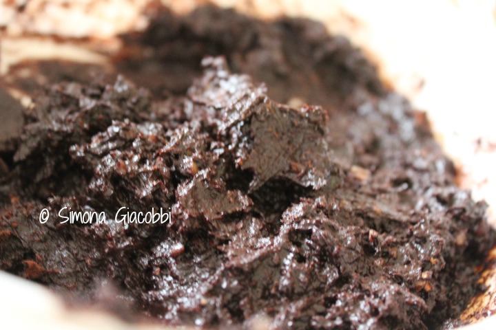 Preparate ora il ripieno. Sbriciolate finemente gli amaretti e metteteli in un contenitore insieme al cacao, la marmellata di prugne e le castagne sbriciolate. Mescolate molto bene fino a ottenere un ripieno bello compatto.