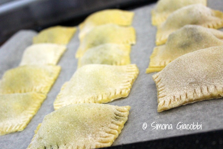 Prente parte della pasta e stendetelo. La pasta dovrà avere uno spessore di circa 1-2 centimetri. Ricavate tanti rettangoli. Disponete al centro aiutandovi con un cucchiaio il ripieno. Richiudete prendendo un lembo all’estremità di ciascun rettangolo (messo in posizione verticale) e sigillandolo bene con i rembi di una forchetta in modo che il ripieno non possa uscire durante la cottura. Disponeteli su una teglia coperta da carta forno e fate cuocere in forno preriscaldato a 180°C fino a quando saranno di un bel colore dorato (per circa una ventina di minuti).